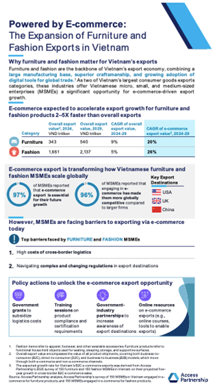 At the event, representatives of Access Partnership will present the report “E-commerce Promoting Export Activities 2025,” featuring in-depth analysis of two of Vietnam’s key export sectors: fashion and furniture.